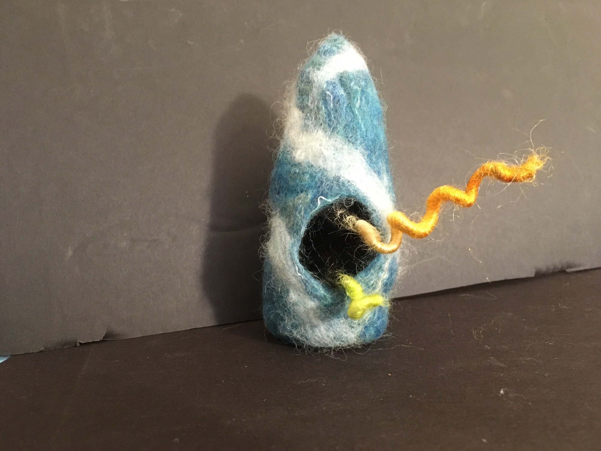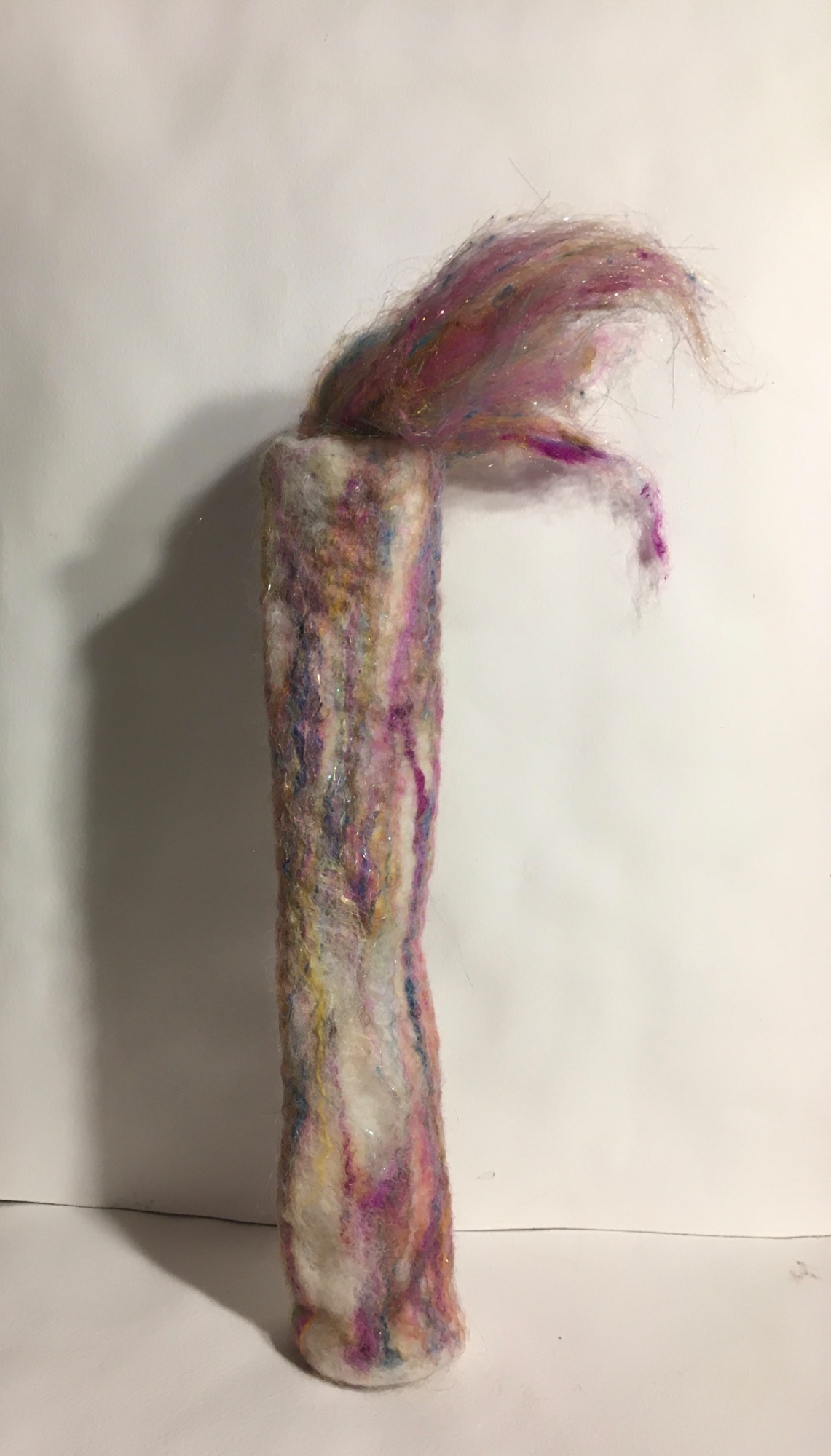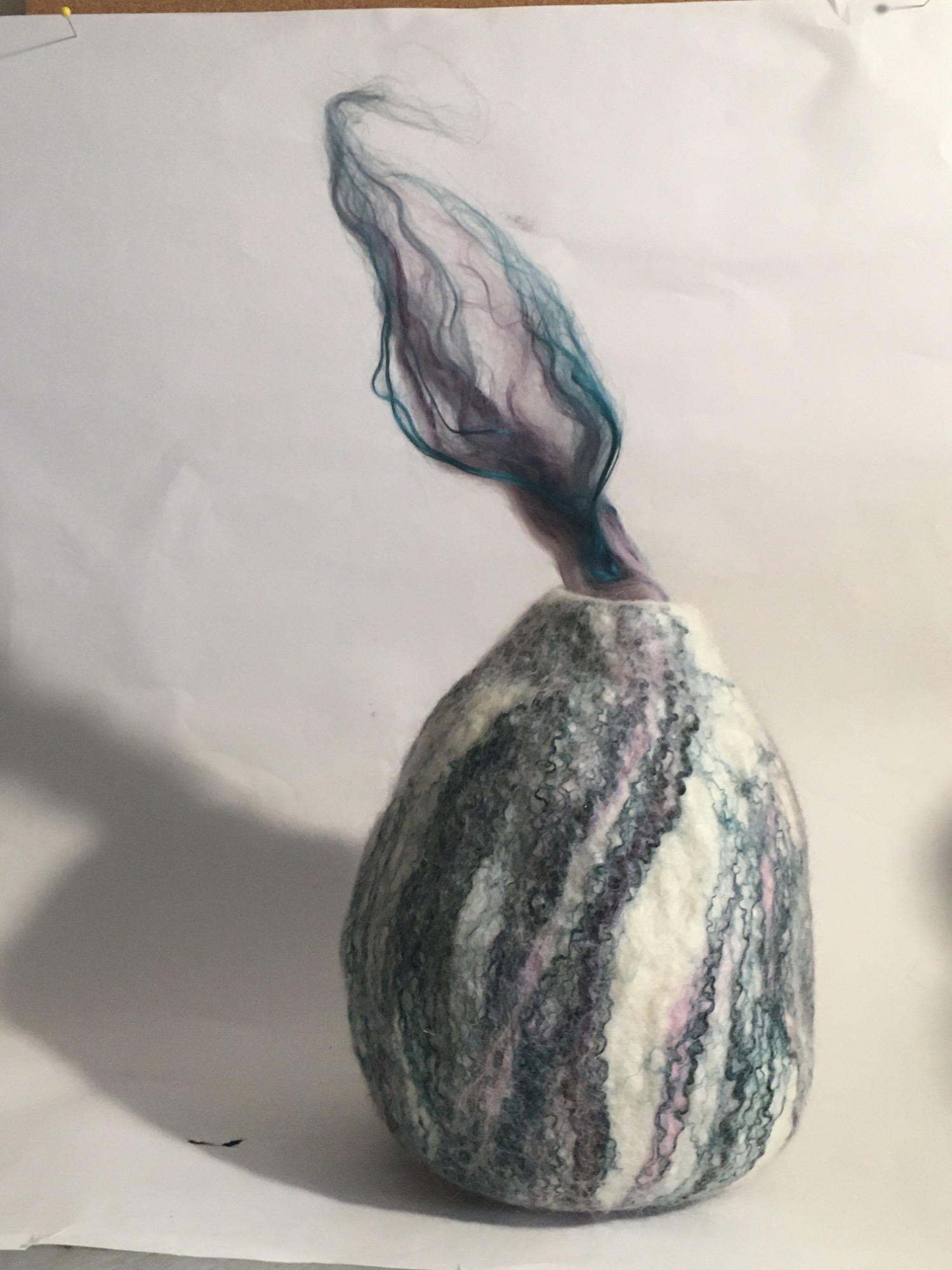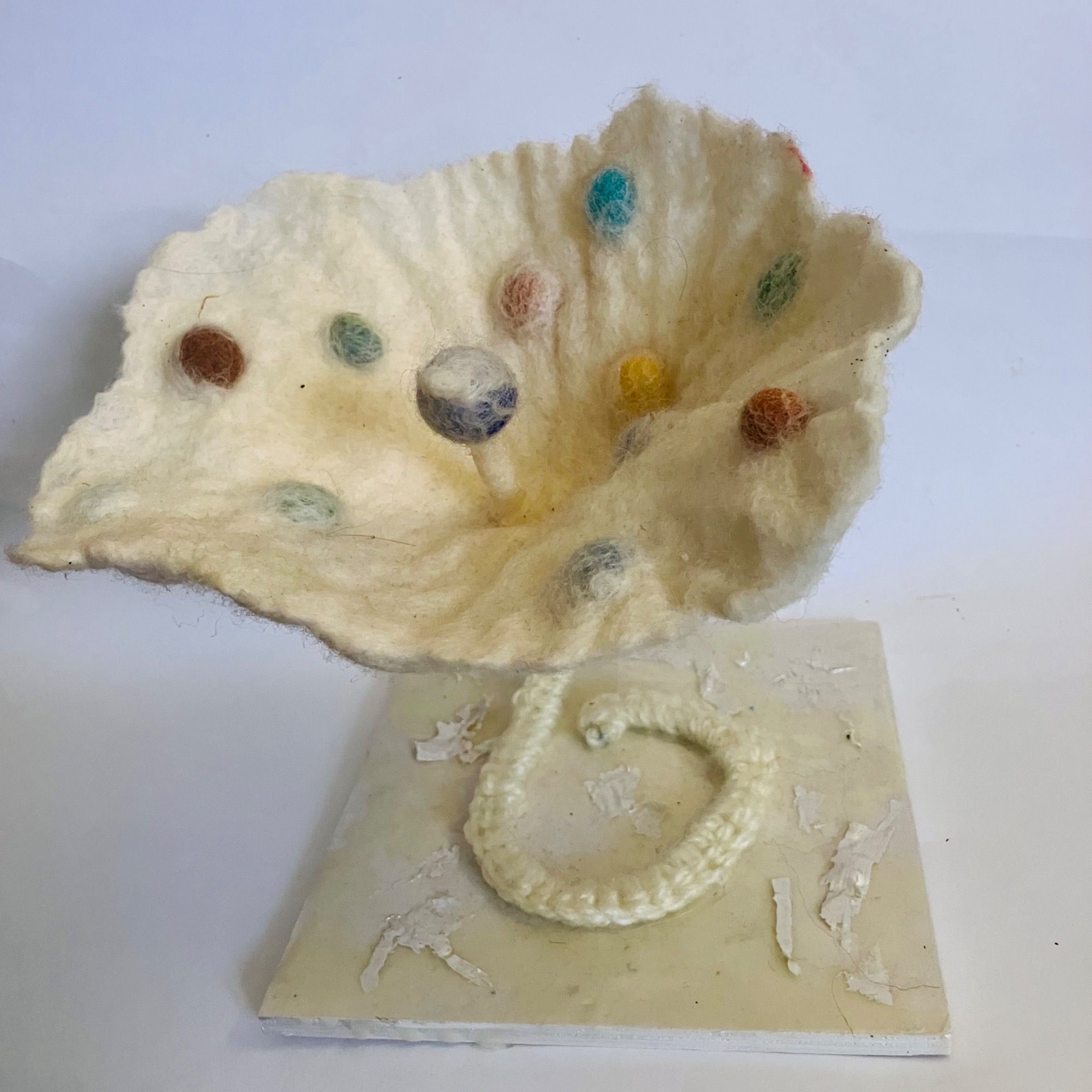 Wool, warm, soapy water, bubble wrap, a resist, rub rub rub, roll roll roll - the barbs of the wool lock and form solids from soft web like fiber.