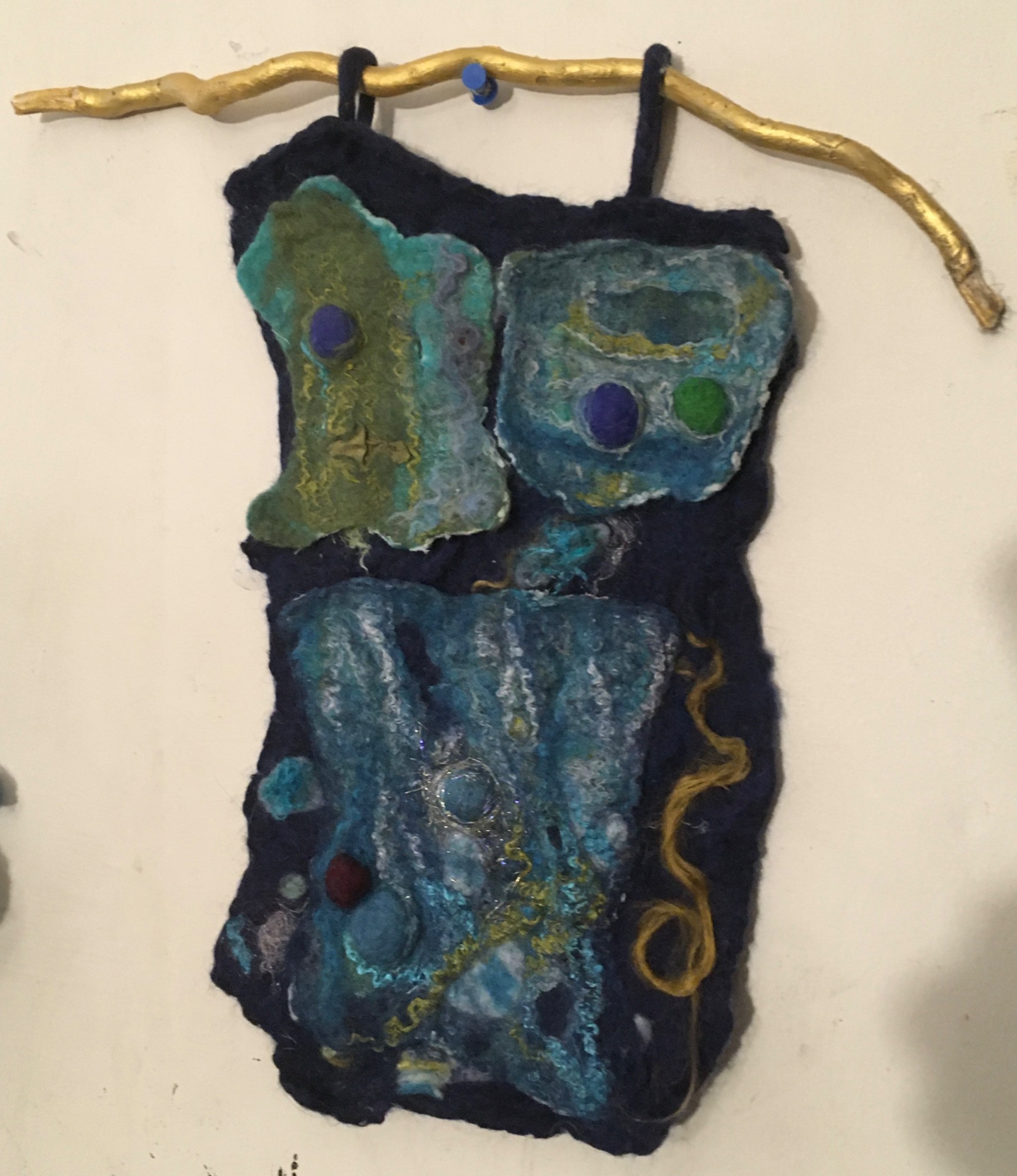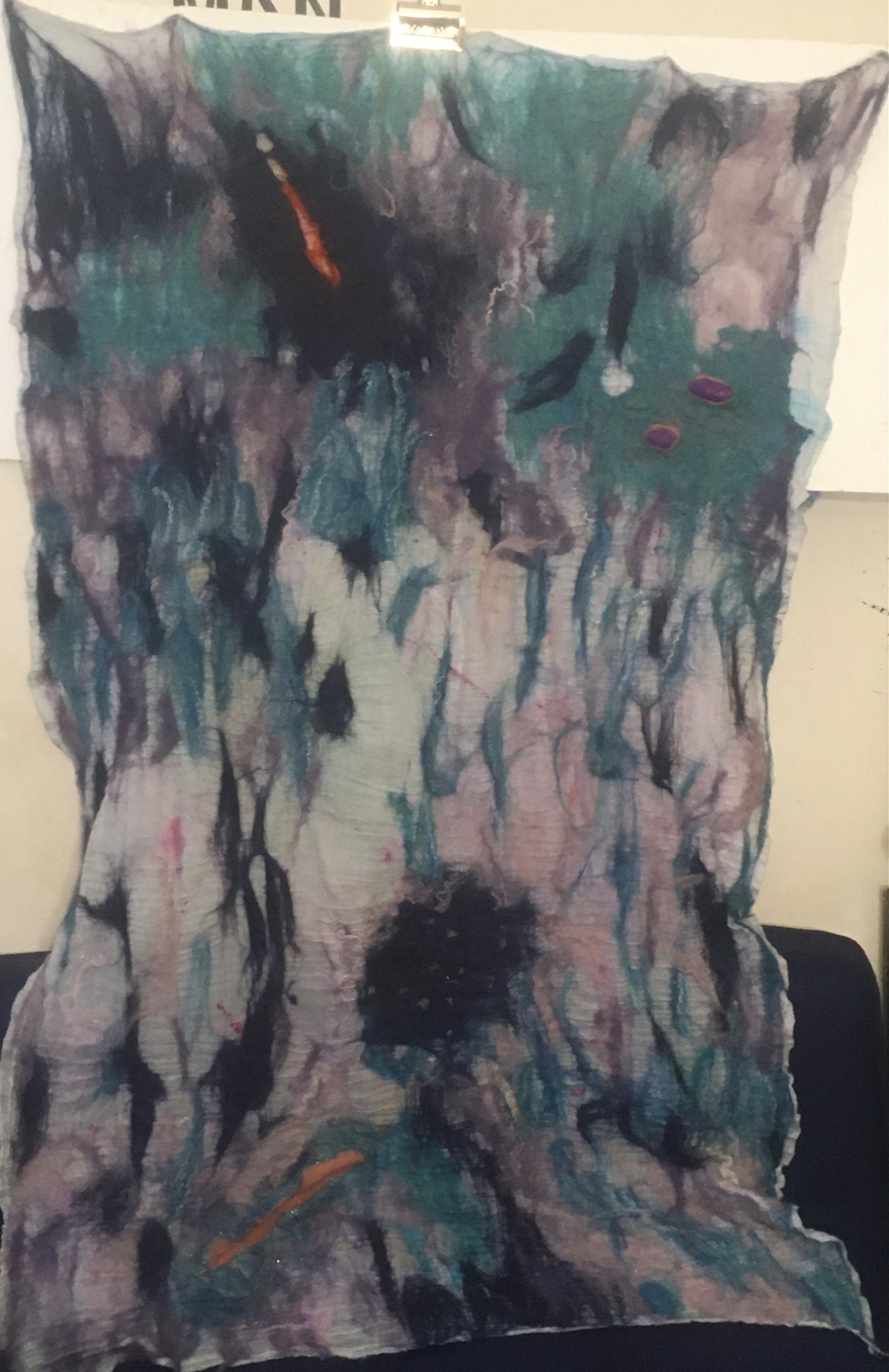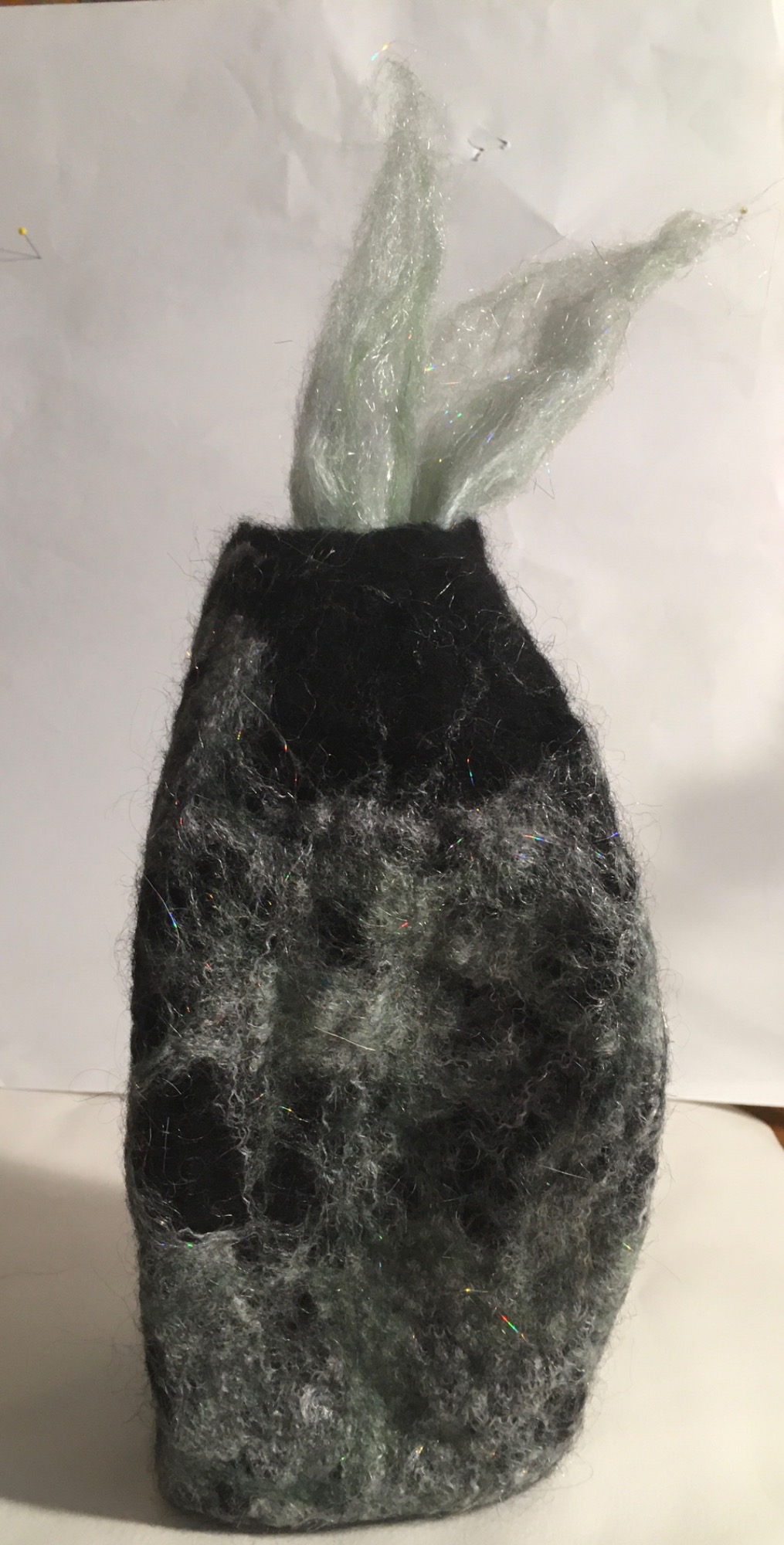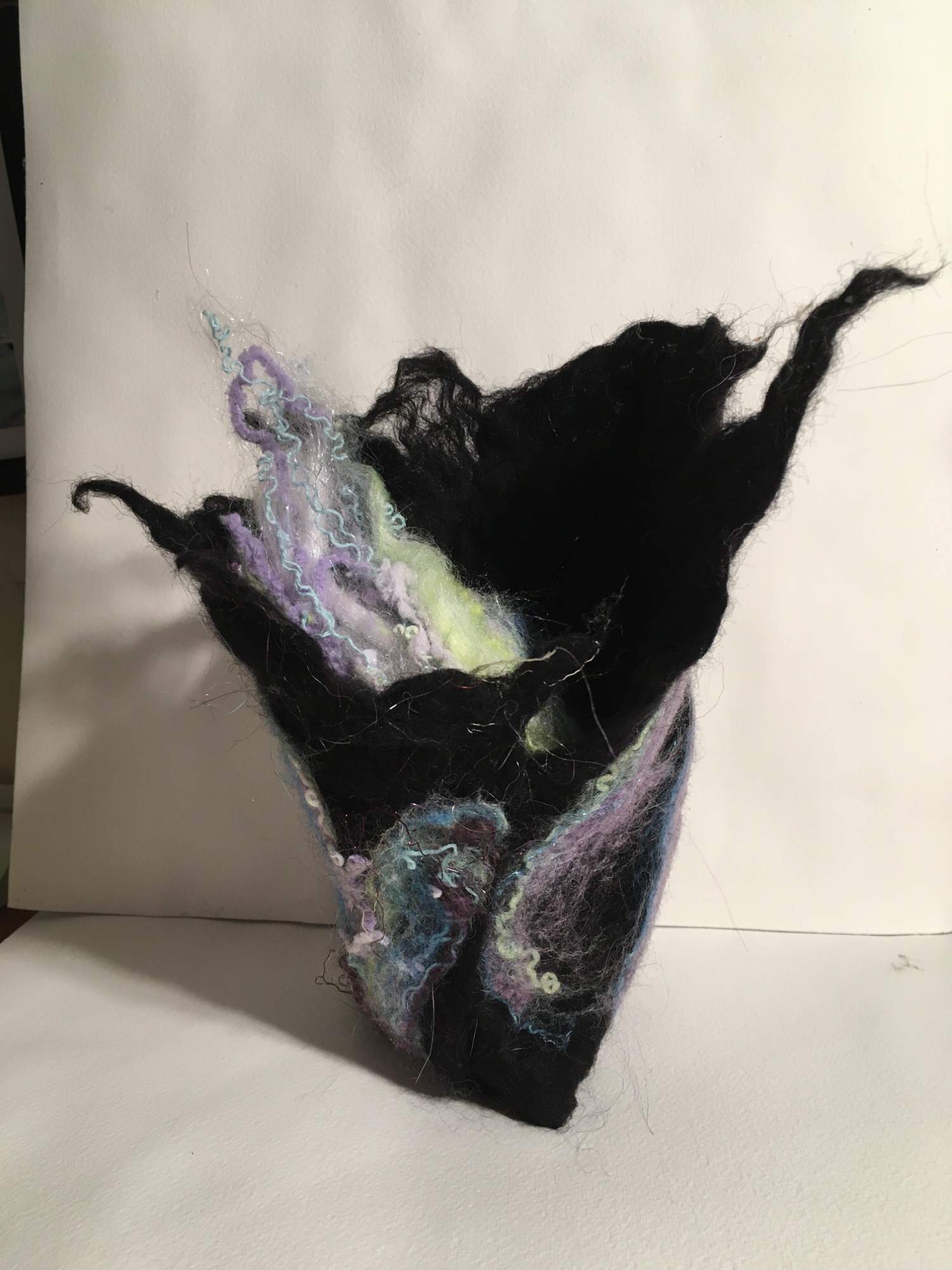 Wool, warm, soapy water, bubble wrap, a resist, rub rub rub, roll roll roll - the barbs of the wool lock and form solids from soft web like fiber.