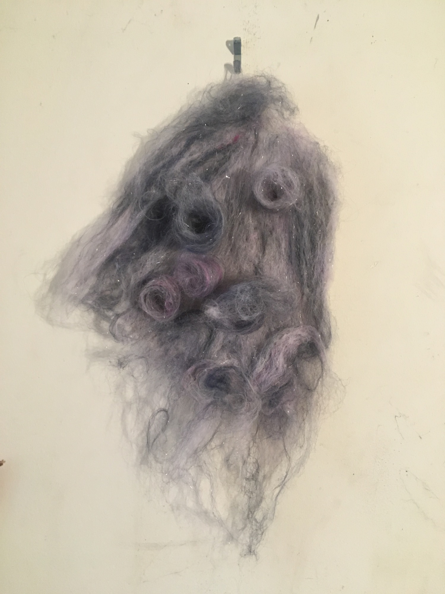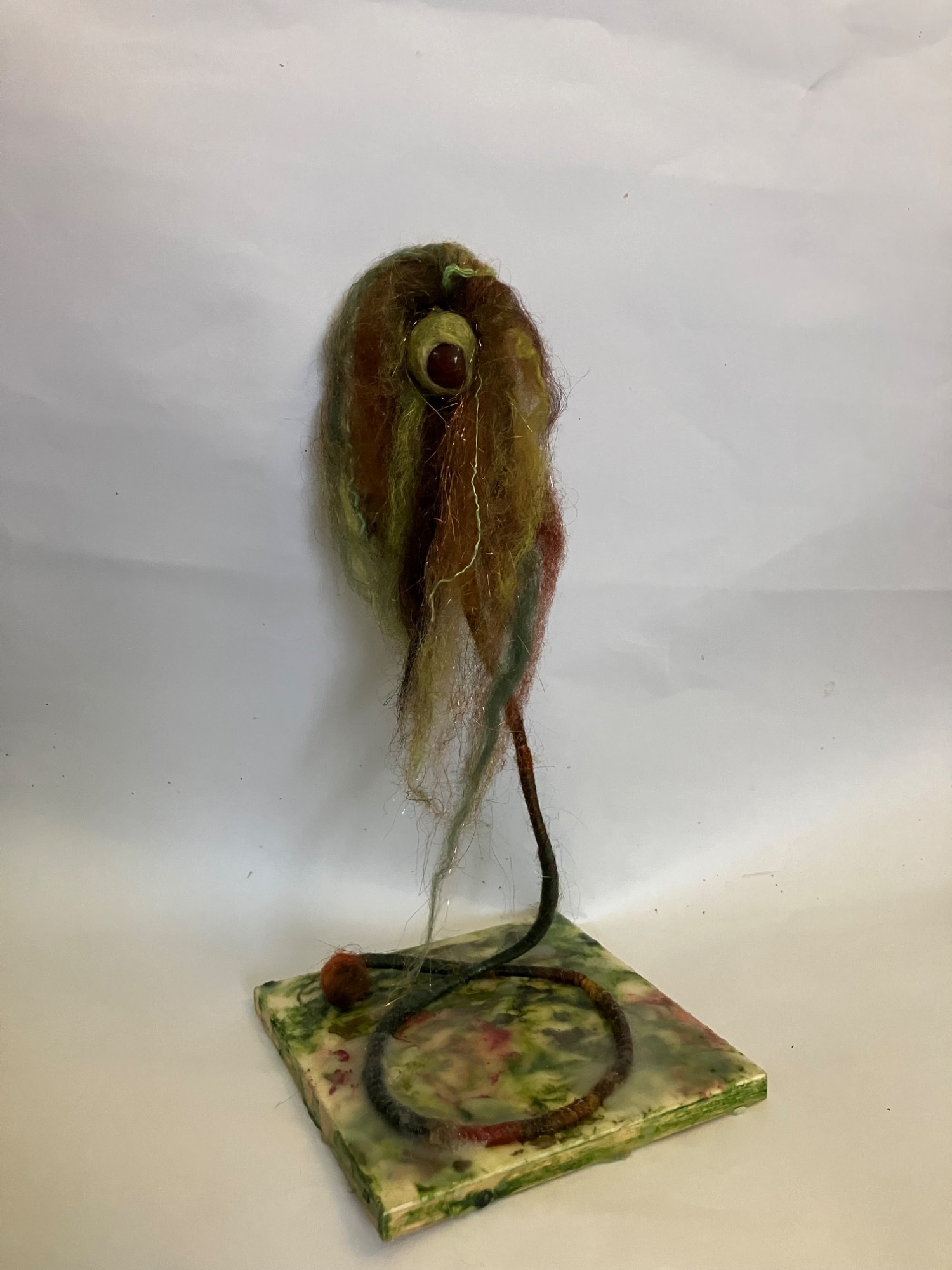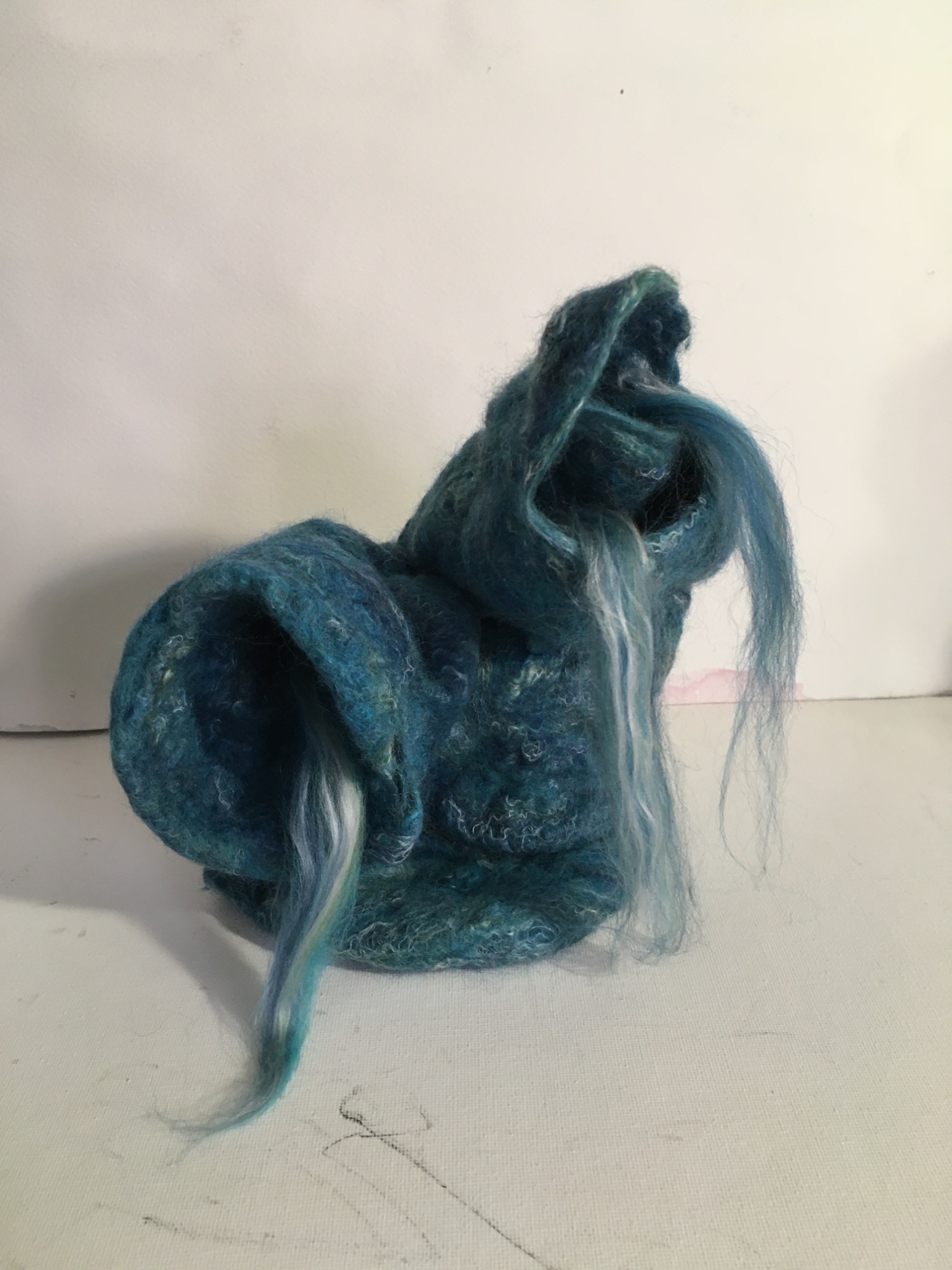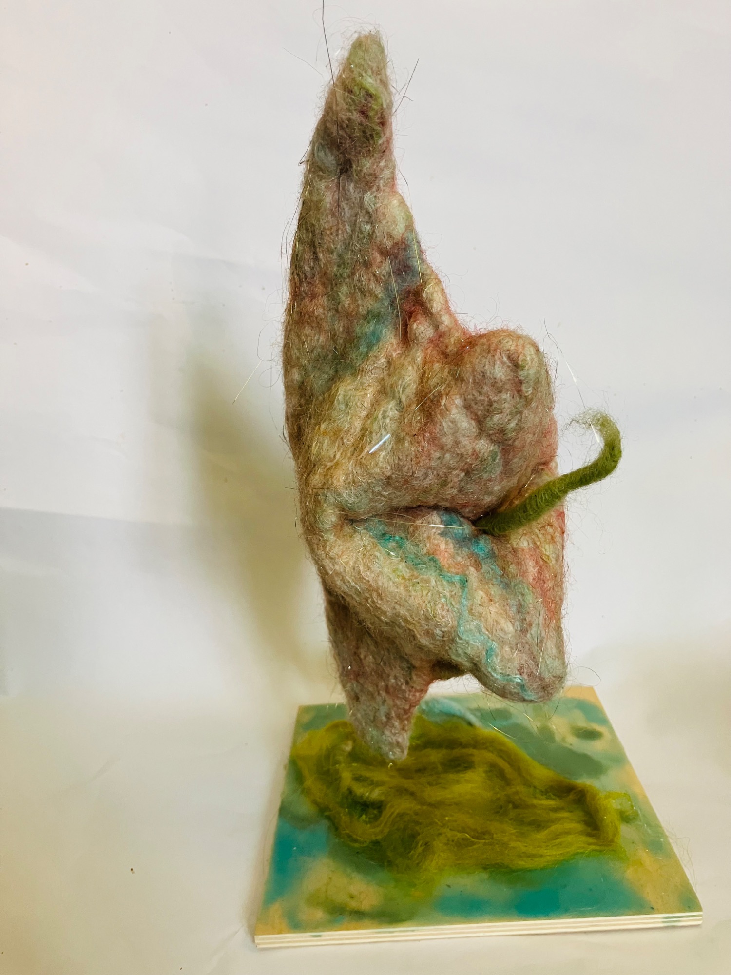 Wool, wet felted and needle felted, wire, wood, encaustic wax come together to make these sculptures